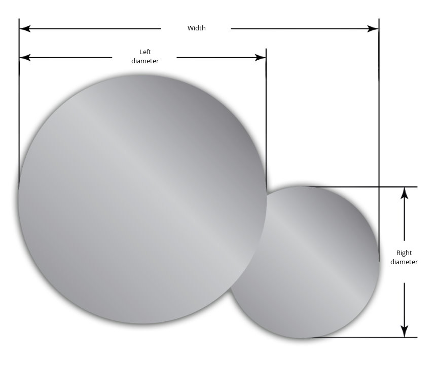 The dimensions of the mirror are defined by three parameters: Left Diameter, Right Diameter, and Width. The Width determines the overall dimensions of the composition. To specify the mutual arrangement of the circles, indicate it in the comments, for example: the mirror on the right at 2 o'clock relative to the mirror on the left.