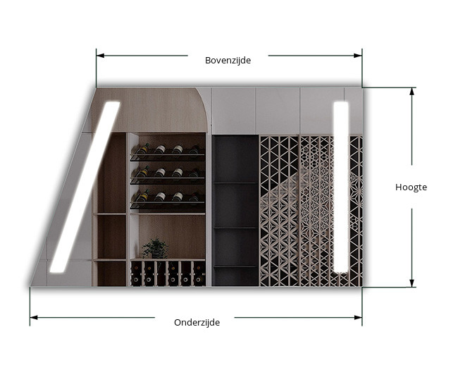 De afgeschuinde kant van de spiegel is aan de linkerkant.
